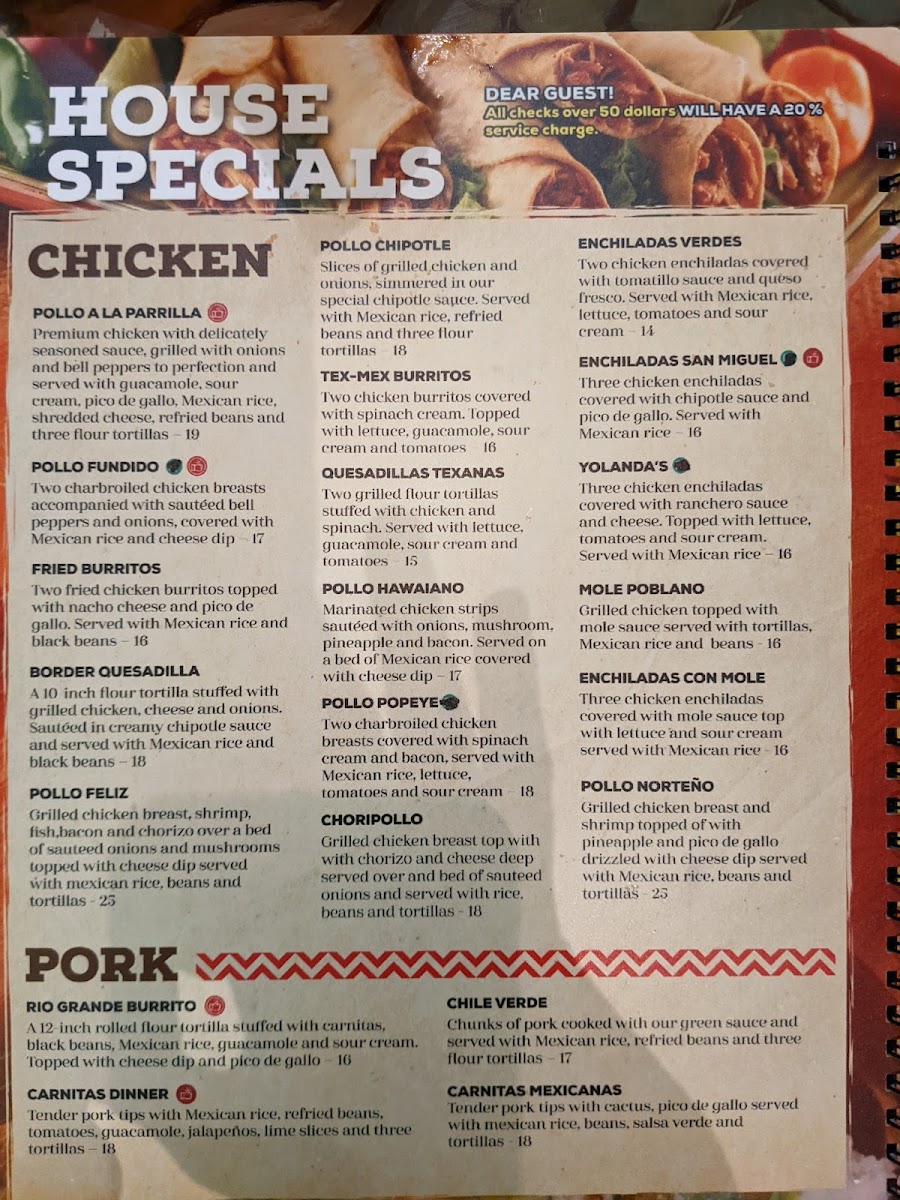 Grilled chicken breast. Topped with chorizo and cheese sauce. Served with rice and beans. Choice of corn or flour tortillas.