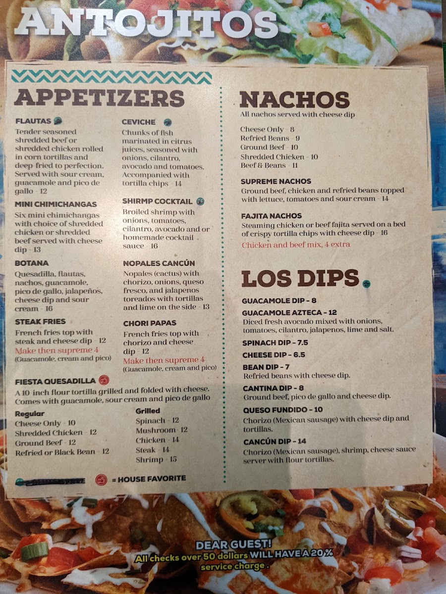 Two fried tortillas filled with chicken, pork, or beef. Topped with cheese sauce. Served with rice, beans, lettuce, pico de gallo, guacamole, and sour cream.